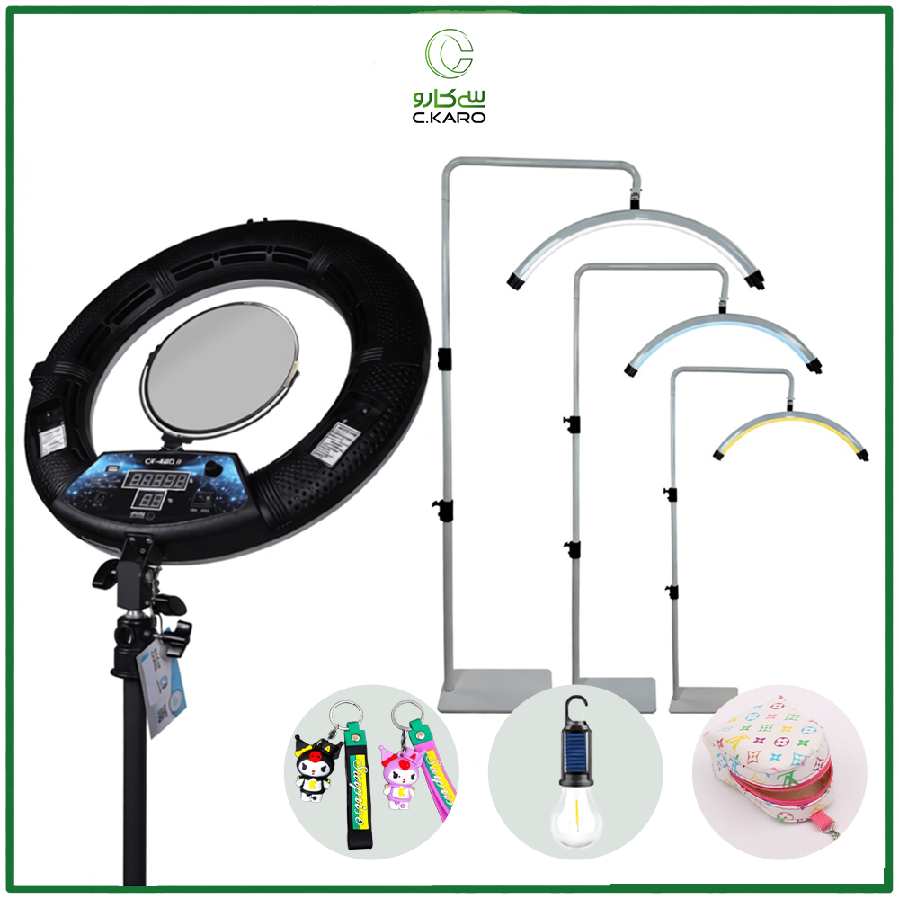 • رینگ لایت ||CK480 با ۴۸۰ LED، تنظیم شدت نور ۰ تا ۹۹٪، حالت‌های نوری متنوع و ریموت کنترل، مناسب عکاسی، تولید محتوا و سالن‌های زیبایی است.